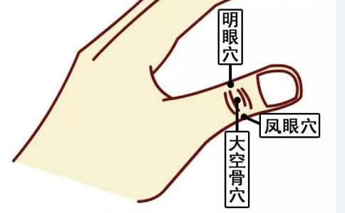 在我们的拇指上有三个相邻接的穴道,分别是明眼、凤眼、大空骨。